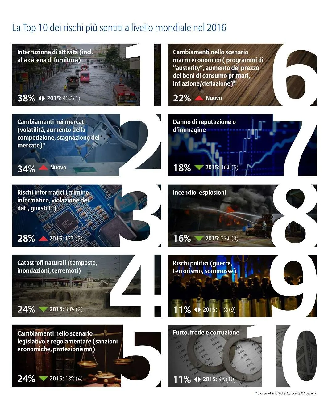 Per l’Allianz Risk Barometer 2016 le interruzioni di attività si confermano al primo posto tra i rischi più temuti, ma…