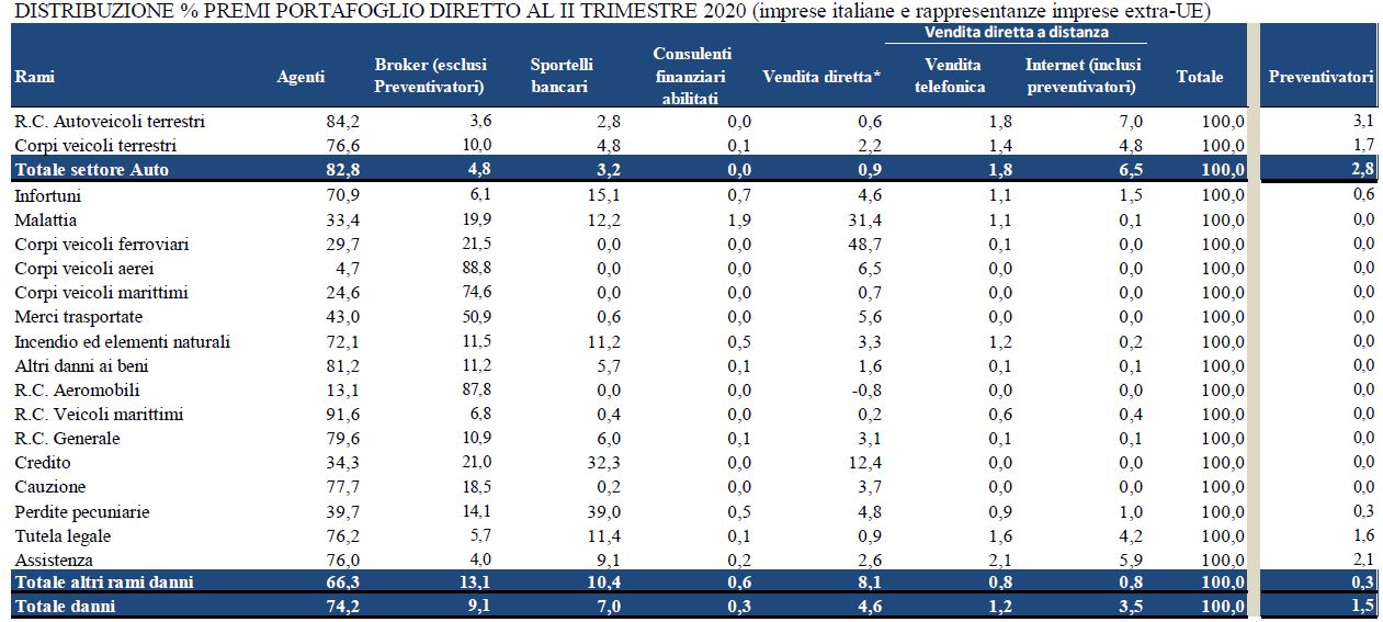 La suddivisione per canale distributivo conferma la leadership del canale agenziale, con un market share del 74,2%. Seguono la vendita diretta nel suo complesso (9,3%), i broker (9,1%), gli sportelli bancari (7%) e i consulenti finanziari abilitati (0,3%).