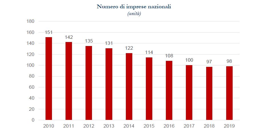 Tra il 2010 e il 2019 il numero di imprese nazionali si è gradualmente ridotto, passando da 151 a 98 (nel 2018 erano 97), con una contrazione del 35%.