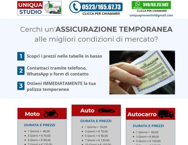 I riferimenti che compaiono sono questi: uffici in via Alessandro Bolzoni 27 a Piacenza, telefono 0523-1656773, whatsapp 349-6323582, e-mail uniquapreventivi@gmail.com.