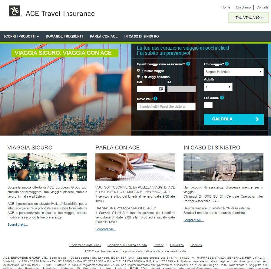 Ace Group ha lanciato in Italia la sua piattaforma per l’acquisto delle polizze di assicurazione viaggi on line, direttamente sul sito www.acetravelinsurance.it (nella foto, l’home page). I prodotti comprendono i costi relativi all’annullamento, la riprotezione e l’interruzione del viaggio, l’assistenza 24 ore su 24, le spese mediche all’estero e la protezione del bagaglio, per viaggi effettuati in Italia o all’estero, per motivi di piacere, di studio o di lavoro.