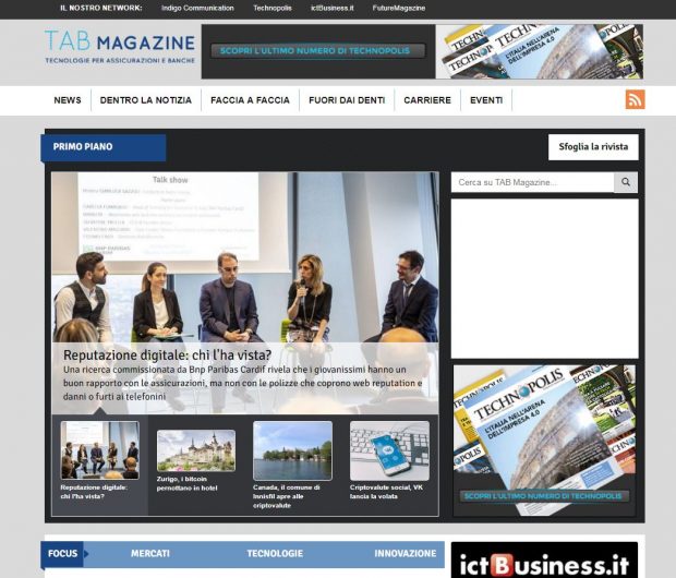 Ai nastri di partenza Tab Magazine (www.tabmagazine.it), giornale on line specializzato in tecnologia per il settore assicurativo e bancario-finanziario. I temi trattati dal portale web sono diversi: si va dall’informatica più tradizionale per banche e assicurazioni alla sfida di fintech e insurtech, dal comparto dei pagamenti elettronici alle criptovalute, dalla instant insurance alle applicazioni di trading, dal crowdfunding alle polizze per coprire il cyber risk.
