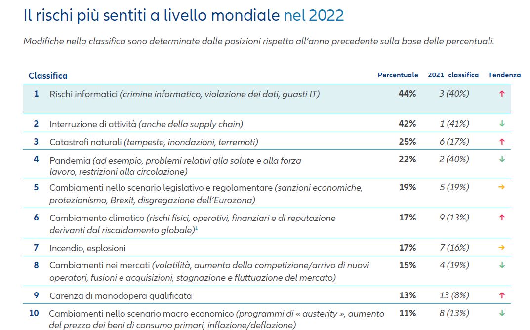 LA CLASSIFICA IN ITALIA – In Italia, i rischi informatici (52%) e l’interruzione di attività (45%) si posizionano, per il secondo anno consecutivo, al primo e al secondo posto nella classifica dei primi 10 rischi. Le catastrofi naturali (33%) entrano tra i primi tre con il 33% delle risposte (al posto di scoppio della pandemia che scende dalla terza alla quinta posizione). Quarto posto per i cambiamenti nello scenario legislativo e regolamentare (23%). Seguono: cambiamenti nei mercati, pandemia e richiamo di prodotti (16%), cambiamento climatico e danno reputazionale o di immagine (13%) e cambiamenti nello scenario macro economico (10%).