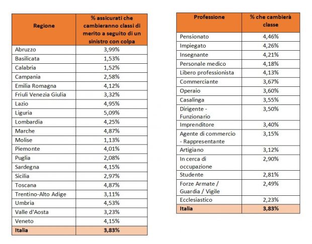 Leggendo i dati in base alla professione dichiarata in fase di preventivo (tabella sotto), emerge che sono i pensionati gli automobilisti meno prudenti; tra loro, il 4,46% vedrà un aumento delle tariffe Rc auto a causa di un incidente con colpa. Seguono gli impiegati (4,26%) e gli insegnanti (4,21%). Valori sopra la media nazionale anche per il personale medico (4,18%, percentuale in calo rispetto allo scorso anno, quando occupavano la prima posizione in classifica con il 5,03%) e i liberi professionisti (4,13%). Nessuna novità, invece, rispetto alla classifica degli automobilisti più virtuosi; stabili nelle prime posizioni gli ecclesiastici (2,23%) e le forze armate (2,49%).