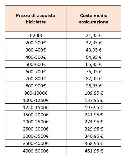Lo studio parte dal presupposto che in Italia circolano 4 milioni di biciclette e ogni 2 minuti ne viene rubata una. Il mezzo, tuttavia, puo essere assicurato. Secondo i dati di Facile.it, il costo medio per sottoscrivere una polizza (tabella a lato) è pari a circa il 10% del valore del mezzo, con un premio minimo di 22 euro l’anno (se la bici vale fino a 200 euro). La copertura assicurativa non si ferma al solo caso del furto del veicolo, ma garantisce anche per la riparazione rapida in caso di danni, il servizio clienti gratuito, e offre protezione anche per il furto di singoli pezzi, come il sellino o la ruota (la maggior parte delle assicurazioni biciclette non prevede franchigia).