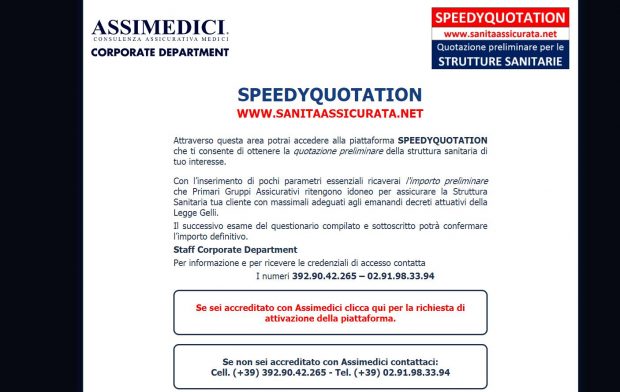 Assimedici, società di brokeraggio guidata da Attilio Steffano e specializzata nell’assicurazione dei rischi in sanità, da oggi ha reso disponibile per gli intermediari accreditati la nuova piattaforma www.speedyquotation.it.