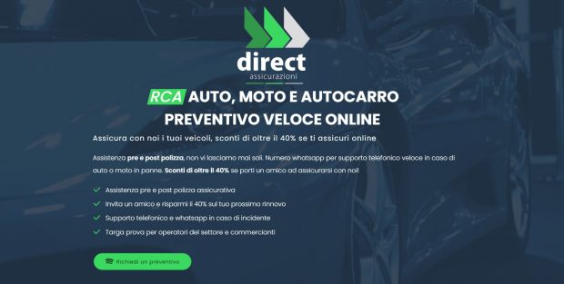 Attraverso il sito www.preventivatoredirect.com distribuisce polizze (farlocche) temporanee Rc auto, moto e autocarri, promettendo sconti di oltre il 40%.