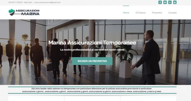 Ecco quanto appare nella sezione “chi siamo” con l’obiettivo di catturare l’attenzione del cliente: «Marina Assicurazioni è una società di intermediazione assicurativa operante in Italia dal 1997. Il broker assicurativo svolge una serie di attività volte ad offrire al cliente (persone, aziende pubbliche e private, professionisti, ecc) la migliore soluzione assicurativa su misura delle sue esigenze specifiche. L’attività di una società di brokeraggio assicurativo si compone di più fasi: l’analisi preliminare dei rischi identificando le necessarie coperture assicurative; l’offerta al cliente del miglior prodotto presente sul mercato assicurativo: durante questa fase il consulente studia quale, tra i vari prodotti offerti dai competitor nazionali ed esteri, risulta più appropriato sia in termini di copertura dei rischi che in termini di economicità.