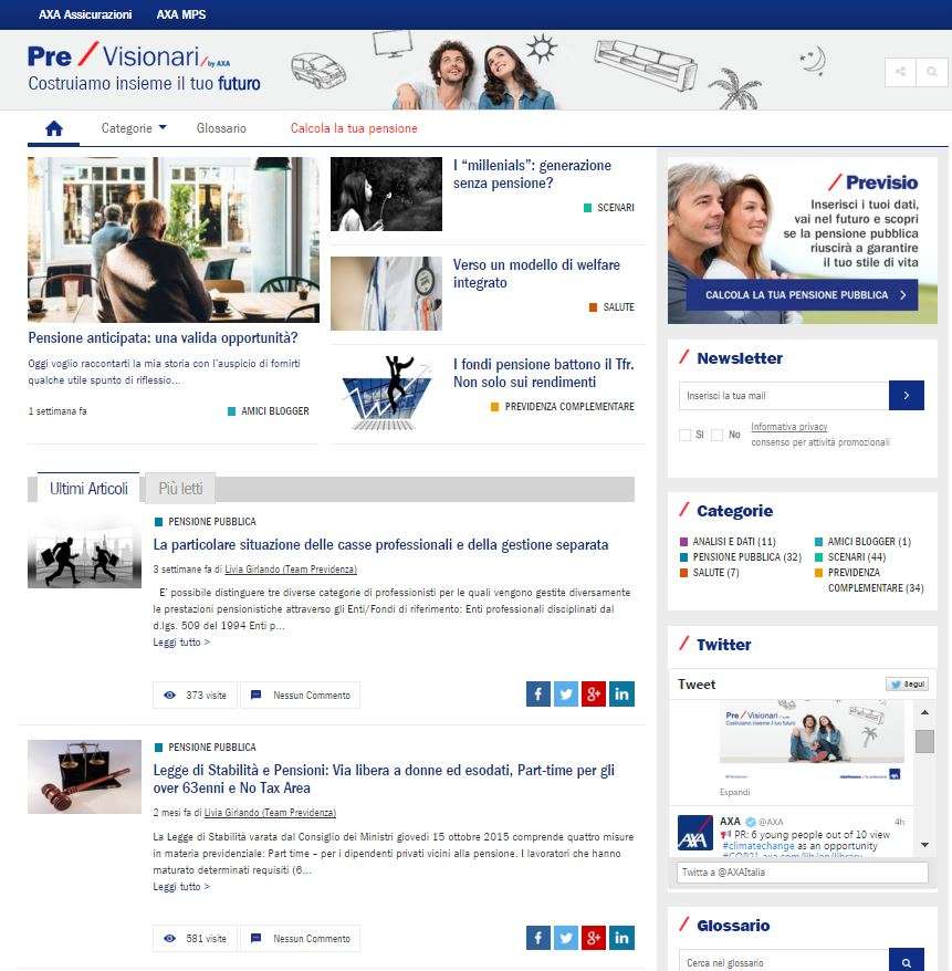 Axa Italia ha rinnovato il suo portale dedicato alla previdenza (www.previsionari.it). Il sito ha l’obiettivo di informare a 360 gradi su tutte le tematiche legate alla previdenza, in modo semplice e diretto, attraverso riflessioni, ricerche e interviste, con la possibilità anche di dialogare con gli utenti.