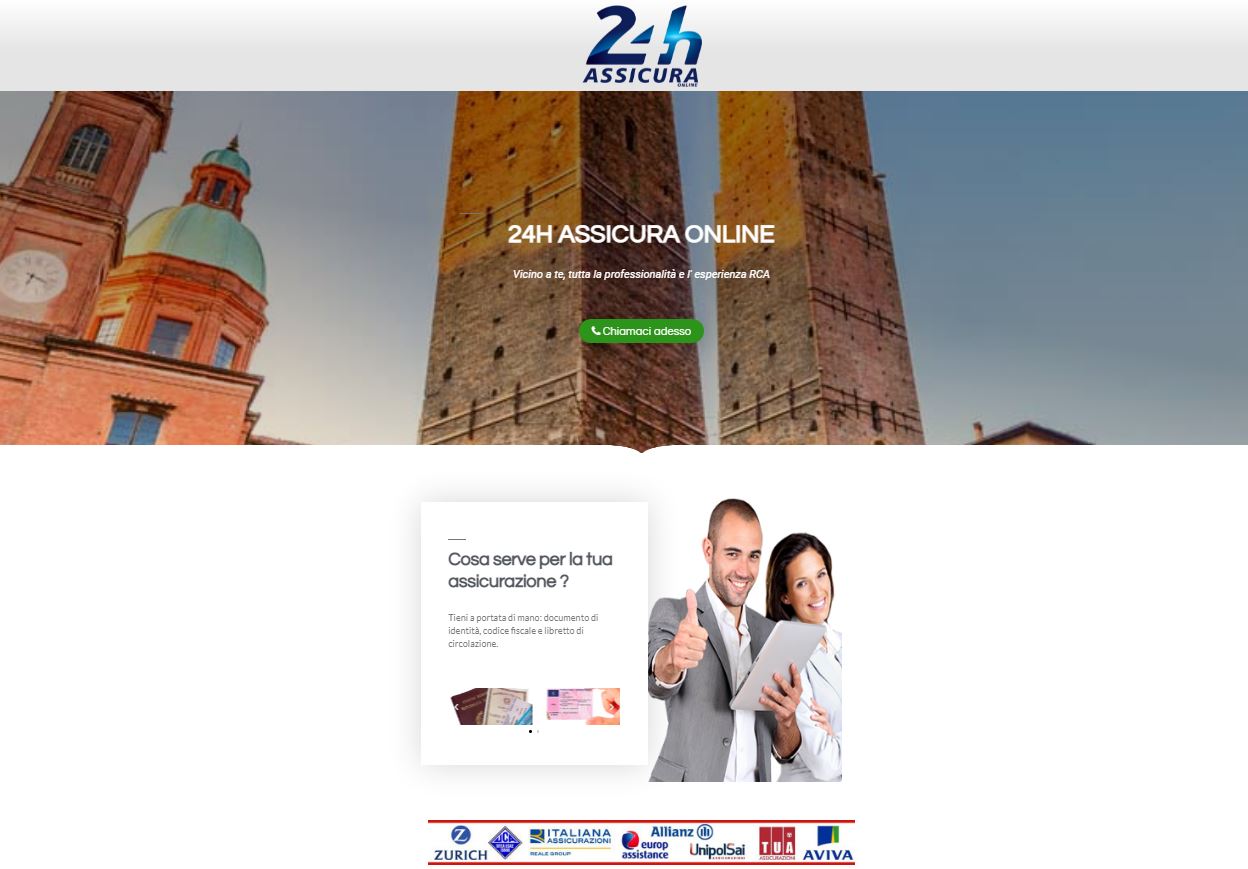 24hassicuraonline.com distribuisce polizze false richiamando i loghi di Zurich, Uca Assicurazione, Italiana Assicurazioni, Europ Assistance, Allianz, UnipolSai Assicurazioni, Tua Assicurazioni e Aviva. Compagnie estranee al portale.