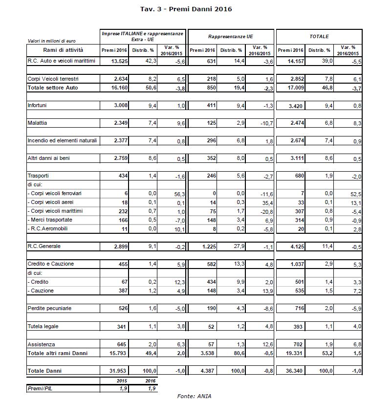 I dati, ha ricordato l’Ania, sono provvisori. Nel 2016 la raccolta premi delle imprese nazionali ed extraeuropee è stata pari a 32 miliardi di euro, in diminuzione dell’1% rispetto al 2015. La dinamica, spiega l’Associazione nazionale fra le imprese assicurative, è il risultato di una diminuzione nel settore auto, i cui premi hanno registrato una flessione del 3,8%, e un aumento negli altri rami danni, i cui premi sono cresciuti del 2%. Insomma non è una sorpresa.