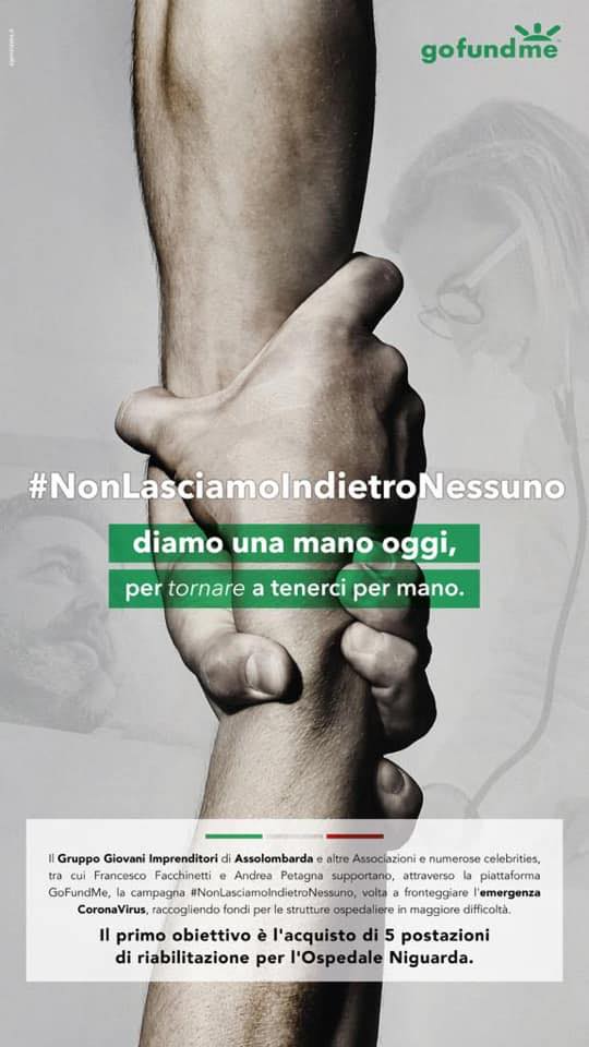 Prosegue con una nuova iniziativa di solidarietà la campagna #NonLasciamoIndietroNessuno, ideata dal Gruppo Giovani Imprenditori di Assolombarda e da altre associazioni e numerosi personaggi noti dello spettacolo e dello sport, per supportare iniziative finalizzate a contenere l’emergenza legata al coronavirus.