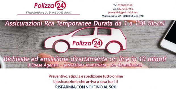 Assicurazioni Rc auto temporanee durata da 1 a 120 giorni; richiesta ed emissione direttamente on line in 10 minuti, zero spese agenzia, attivazione immediata, no commissioni. È il messaggio che figura in bella vista nella home page del sito www.polizza24.net.