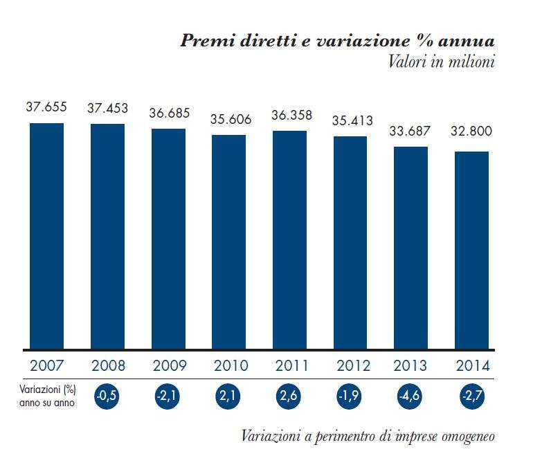I premi diretti del lavoro raccolti dalle 81 imprese italiane e dalle due rappresentanze di imprese extra-europee sono stati pari a 32,8 miliardi di euro, in calo del 2,7% rispetto al 2013. Il calo è dovuto essenzialmente alla diminuzione dei premi del settore auto.