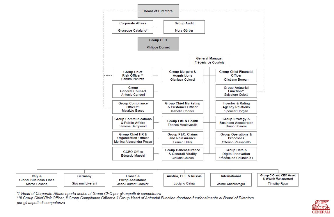 È stata inoltre riorganizzata la struttura global business lines & international. Per quanto riguarda le global business lines, le responsabilità sono state così riallocate: al country manager Italia, Marco Sesana, è stata affidata la responsabilità di global corporate & commercial, Generali employee benefits e Generali global health, mentre al country manager France, Jean-Laurent Granier, è stata affidata la responsabilità di Europ Assistance Group.