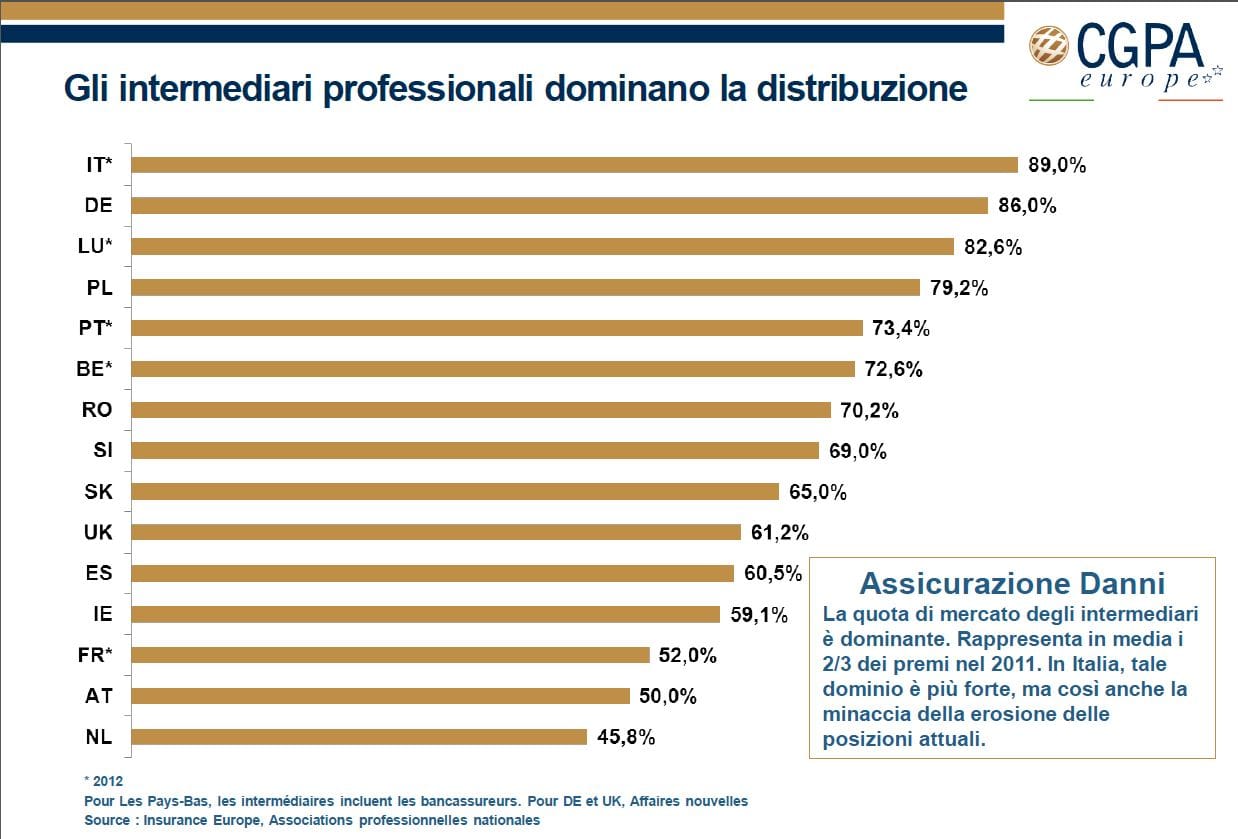 L’indagine condotta da Cgpa Europe, compagnia specializzata nell’assicurazione dei rischi professionali degli intermediari assicurativi, in collaborazione con il Monitoring european distribution of insurance (Medi), evidenzia il fatto che, in Europa, i due terzi dei premi assicurativi per il ramo danni e la metà dei premi per il vita sono raccolti da agenti e broker.