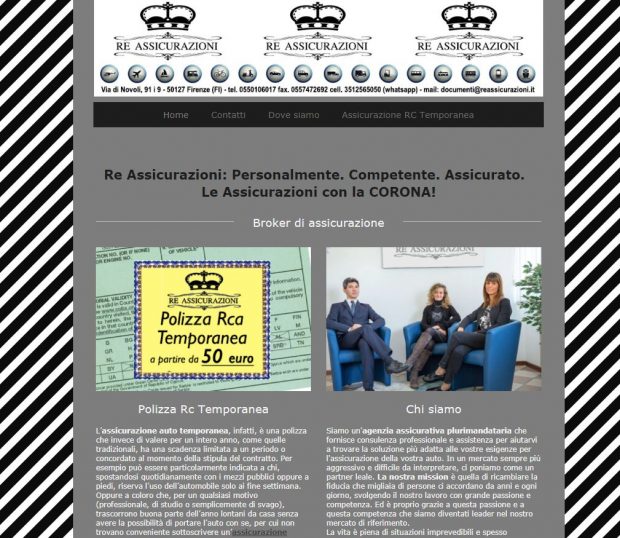 Il sito si presenta come «un’agenzia assicurativa plurimandataria (ma in home page compare anche la scritta “broker di assicurazione”) che fornisce consulenza professionale e assistenza per l’assicurazione dell’auto». Re Assicurazioni dichiara anche che «in un mercato sempre più aggressivo e difficile da interpretare», si pone come «un partner leale». E visto che «la vita è piena di situazioni imprevedibili e spesso inevitabili, è molto importante sapere di contare su una polizza adeguata stipulata con una buona agenzia assicurativa». I riferimenti riportati sul sito sono questi: via di Novoli 91 i 9 a Firenze, telefono 055-0106017, fax 055-7472692, cell. 351-2565050.