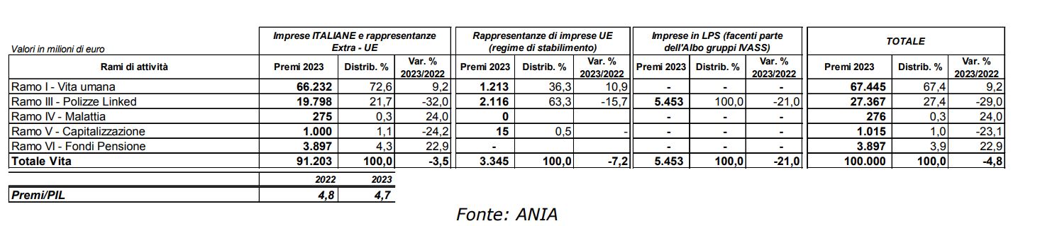Con riferimento alle sole imprese nazionali e alle rappresentanze di imprese extra europee, nel 2023 la raccolta premi nei rami vita è stata pari a 91,20 miliardi di euro (-3,5% rispetto all’anno precedente). Il calo, ha specificato l’Ania, è stato determinato «essenzialmente dalle polizze unit-linked (ramo III) e solo in modo marginale dalle polizze di capitalizzazione (ramo I)».