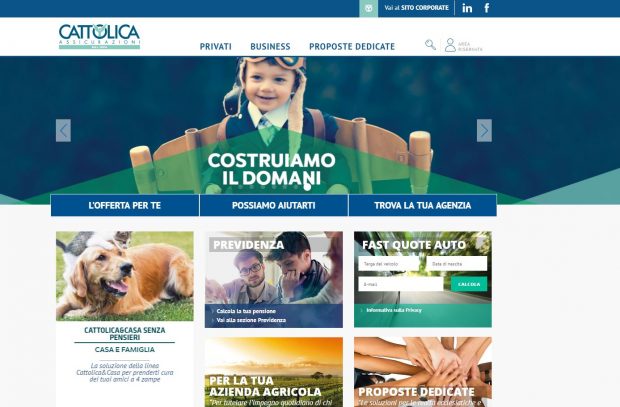Per quanto riguarda l’area customer, costruita per rispondere ai bisogni dei clienti, permette di trovare tutte le informazioni su offerte e prodotti, nonché sulle agenzie Cattolica presenti sul territorio. È una vetrina web completamente rinnovata, integrata con i canali social della compagnia. Il sito è suddiviso nelle sezioni: Fast Quote (per effettuare un preventivo “veloce” per la propria auto, inserendo solo la targa e la data di nascita), Cattolica in Banca (nuova sezione dedicata alla bancassurance che raccoglie l’offerta della compagnia attraverso il canale bancario), Cattolica in un click (sezione che raccoglie tutti i touchpoint fisici della compagnia come agenzie, cliniche e carrozzerie convenzionate), sezione in cui trovano spazio temi “innovativi” (con un corpo centrale dedicato a concorsi, novità tecnologiche e iniziative del momento), nuova home insurance (con un unico accesso sia per i clienti danni, sia per i clienti previdenza).