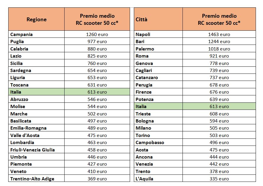 Il premio medio per assicurare uno scooter di cilindrata 50 cc? Secondo un’analisi di Facile.it, broker assicurativo e comparatore di polizze on line, è pari a 613 euro, anche se i valori variano notevolmente da regione a regione.