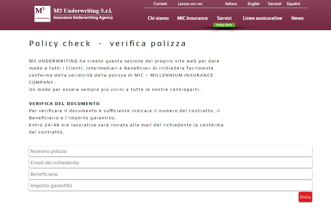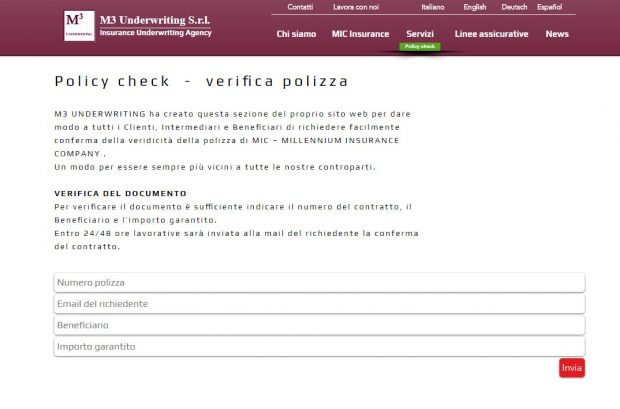 M3 Underwriting, agenzia di sottoscrizione specializzata nel ramo cauzioni e distributore di Millennium Insurance Company, ha messo a disposizione di tutti i clienti, intermediari assicurativi e beneficiari, uno strumento per la verifica delle fideiussioni rilasciate.