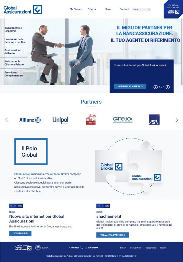 Global Assicurazioni, agenzia di assicurazione plurimandataria del gruppo bancario Credito Valtellinese, ha lanciato una nuova versione del suo sito istituzionale (a lato la home page).