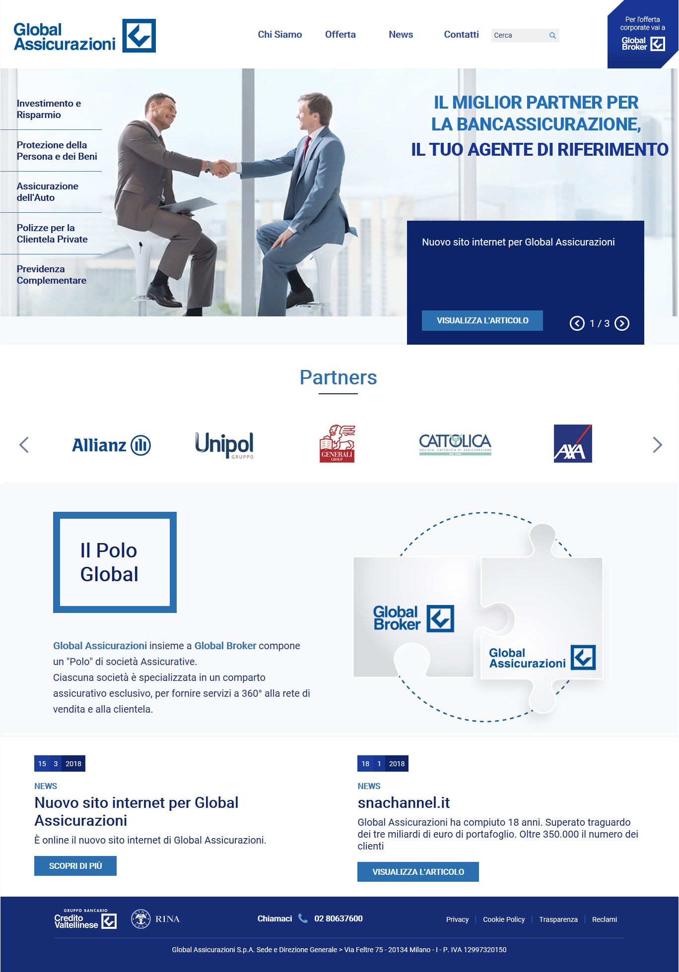 Global Assicurazioni, agenzia di assicurazione plurimandataria del gruppo bancario Credito Valtellinese, ha lanciato una nuova versione del suo sito istituzionale (a lato la home page).