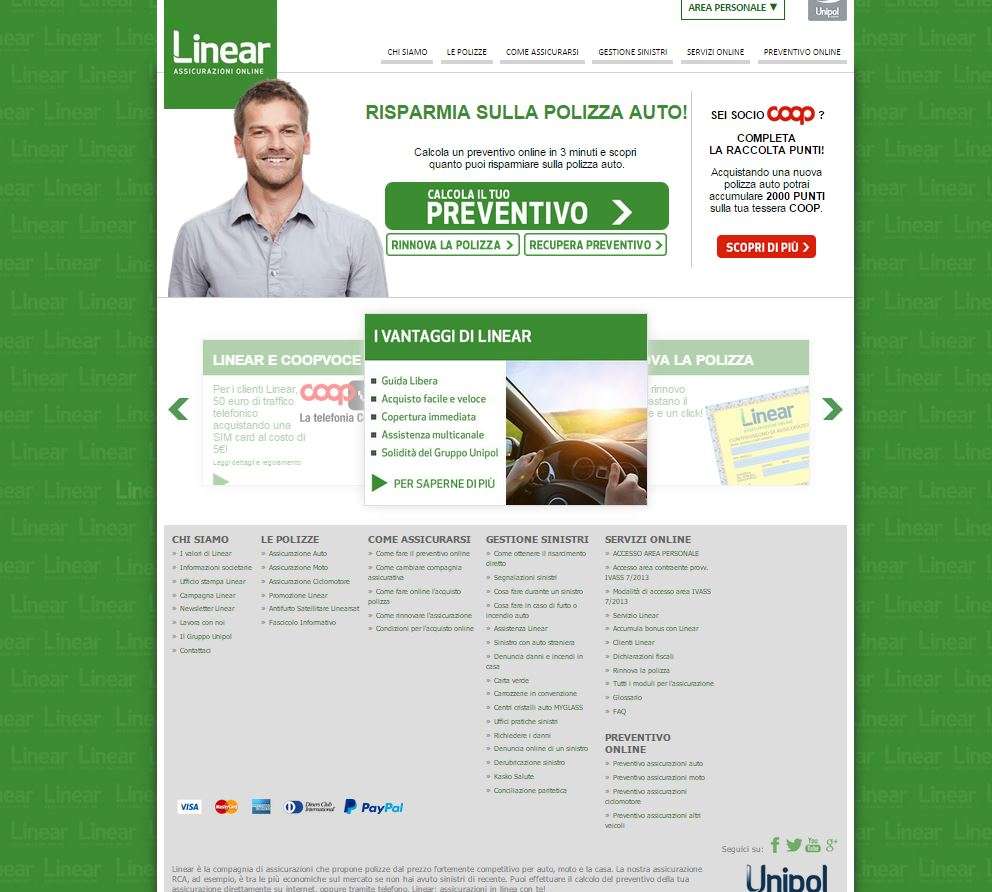 Linear, la compagnia on line del gruppo Unipol, ha ampliato le modalità di pagamento disponibili sul proprio sito, sottoscrivendo un accordo con PayPal, società che offre servizi di pagamento digitale e di trasferimento di denaro on line.