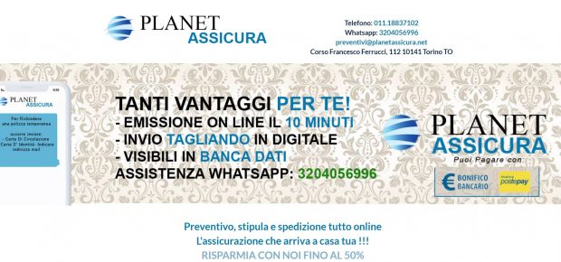 Il contatto riportato sul portale fa riferimento a uffici in corso Francesco Ferrucci 112 a Torino, telefono 011-18837102, whatsapp 320-4056996, e-mail preventivi@planetassicura.net.