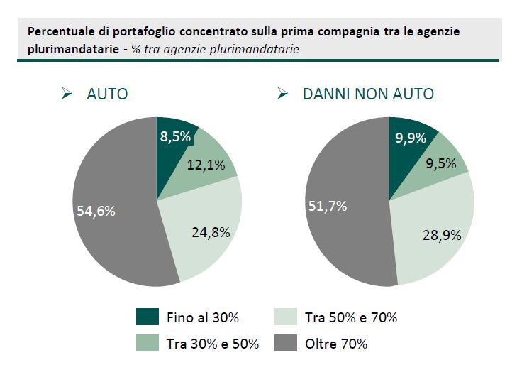 In particolare, una parte consistente degli agenti plurimandatari (vedi la tabella sopra) dichiara di «concentrare sul marchio principale oltre il 70% dei premi: si tratta del 53,2% di loro sull’auto e del 47,9% sui danni non auto; il 43,5% degli agenti con collaborazioni in corso utilizza questo strumento per sopperire alle mancanze della compagnia principale in alcuni ambiti e il 7,7% per non perdere clienti nell’auto; le aree di maggior utilizzo delle collaborazioni riguardano rischi professionali, credito e cauzioni, ossia business specialistici piuttosto secondari per le grandi compagnie generaliste».
