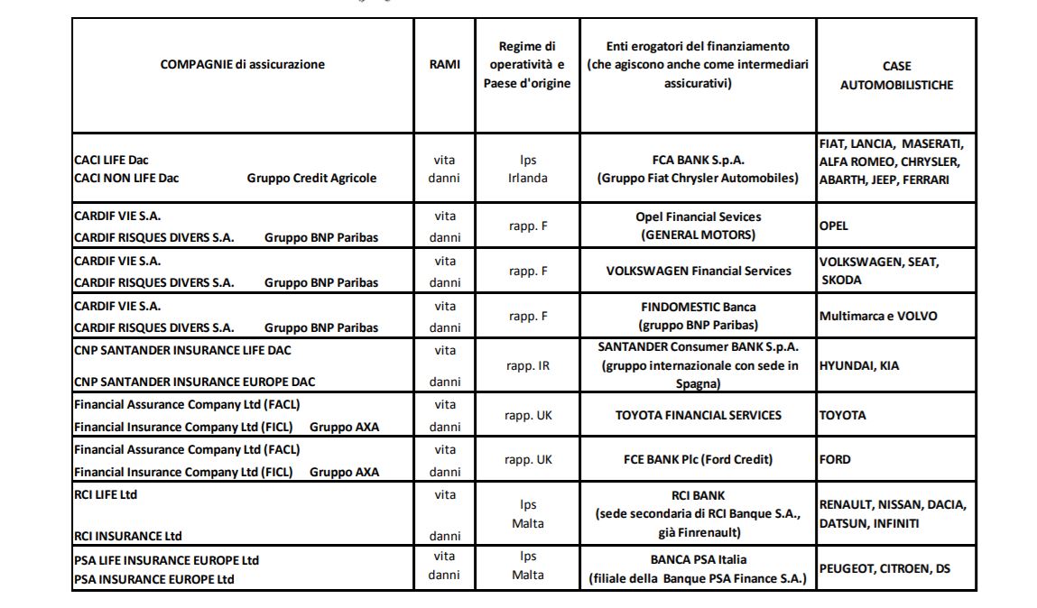 Con lettere in data 28 febbraio 2017, indirizzate a 12 compagnie di assicurazione e a 9 enti finanziatori (che agiscono anche come intermediari assicurativi) collegati a diverse case automobilistiche, l’istituto di vigilanza ha chiesto sia dati qualitativi (copie degli accordi di partnership, fascicoli informativi dei prodotti assicurativi offerti, modulistica per la rilevazione dell’adeguatezza della polizza alle esigenze del cliente e per la rilevazione dello stato di salute, welcome letter ai clienti), sia dati quantitativi (volume di affari, numero dei contratti abbinati alle operazioni di finanziamento, numero dei sinistri denunciati e di quelli rigettati e delle relative cause) necessari per la valutazione delle singole fattispecie.