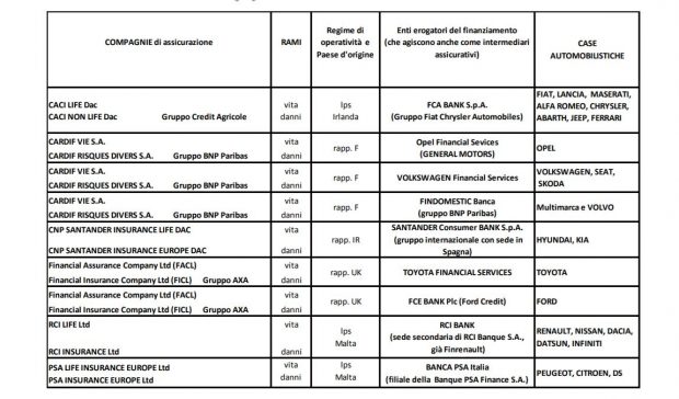 EVIDENTI CONFLITTI DI INTERESSE – Come si nota dalla tabella, delle imprese assicurative oggetto d’esame due sono rappresentanze in Italia di società francesi che operano per tre enti finanziatori, due di imprese britanniche che operano per due finanziatori e due di imprese irlandesi; quattro sono imprese di diritto maltese e due di diritto irlandese. I premi raccolti nel 2016 ammontano a 164 milioni di euro (a fronte di 156 milioni di euro del 2015) e i partners creditizi e assicurativi appartengono allo stesso gruppo della casa automobilistica.