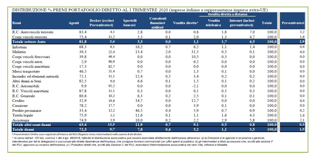 Con riferimento alle singole modalità di distribuzione della vendita diretta, risulta che le agenzie in economia, gli intermediari a titolo accessorio che operano su incarico dell’impresa e i produttori diretti, pesavano per il 5,2% (4,9% l’anno precedente), mentre per il 3,5% il canale internet (come nello stesso periodo del 2019). La quota relativa ai premi veicolati attraverso i preventivatori on line (che sono registrati nella sezione B del Rui) risulta stabile e pari all’1,5%; in particolare nel settore auto questa quota è pari al 2,9%, mentre più bassa e pari allo 0,3% è quella relativa agli altri rami danni. In particolare, i rami in cui, anche se marginalmente, si fa ricorso da parte degli assicurati all’utilizzo di preventivatori on line sono l’assistenza (2,1%), la tutela legale (1,6%), gli infortuni (0,6%) e le perdite pecuniarie (0,2%).