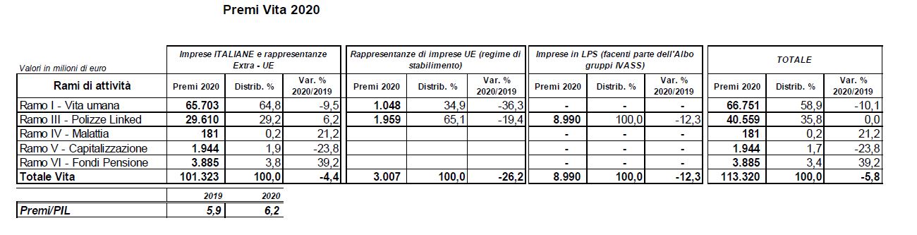Con riferimento alle sole imprese nazionali e alle rappresentanze di imprese extra-europee, nel 2020 la raccolta premi nei rami vita ha appena superato i 100 miliardi di euro (precisamente 101,3 miliardi), in diminuzione del 4,4% rispetto all’anno precedente, quando la raccolta premi era invece aumentata di quasi il 4%.
