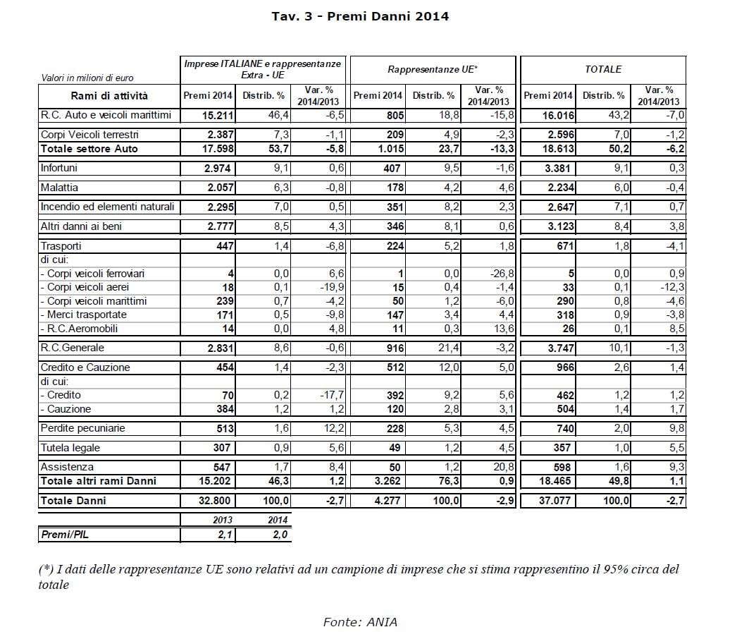 RAMI DANNI – Nel 2014 la raccolta premi nei rami danni è stata pari a 32,8 miliardi di euro (-2,7% rispetto al 2013).