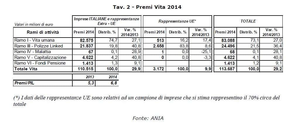 Nel 2014, i prodotti di ramo I (Vita umana) hanno contabilizzato oltre 82 miliardi di premi, il valore più elevato mai registrato in questo ramo (+27%). In crescita anche la raccolta premi di tutti gli altri rami. Nel dettaglio sono cresciuti del 41% i premi delle polizze di ramo III (linked), per un volume di quasi 22 miliardi, rappresentando circa il 20% dei premi totali. Stessa percentuale di crescita si è registrata per le polizze di ramo V (capitalizzazione) i cui premi sono stati pari a 4,6 miliardi (4,2% del totale). Il ramo VI (fondi pensione) ha raccolto premi per 1,4 miliardi in crescita del 9%, mentre le polizze di ramo IV (malattia) sono cresciute del 29%.