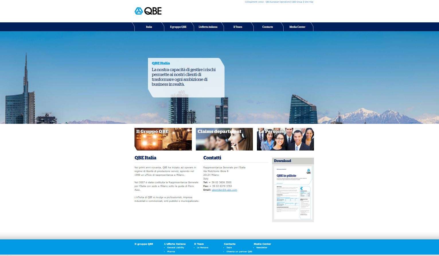 L'home page del sito di Qbe ItaliaCambio di sede per la rappresentanza generale per l’Italia di Qbe Insurance Europe, gruppo assicurativo australiano specializzato nella business insurance: da largo Augusto gli uffici milanesi sono stati trasferiti nel nuovo business district di Porta Nuova, in via Melchiorre Gioia 8.