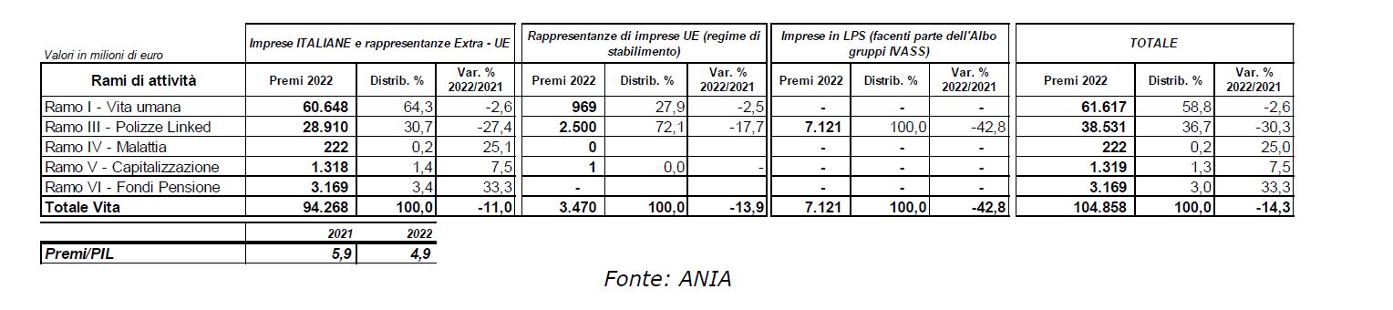 Con riferimento alle sole imprese nazionali e alle rappresentanze di imprese extra europee, nel 2022 la raccolta premi nei rami vita è stata pari a 94,27 miliardi di euro (-11% rispetto all’anno precedente). Il calo, ha specificato l’Ania, è stato determinato «essenzialmente dalle polizze unit-linked (ramo III) e solo in modo marginale dalle polizze tradizionali (ramo I)».
