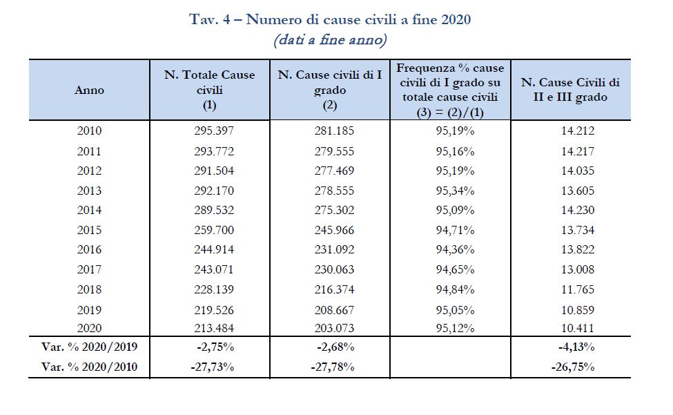 Concentriamoci sui soli numeri del contenzioso civile, le cui cause pendenti, in ogni grado di giurisdizione, hanno registrato un calo del 2,8% rispetto al 2019. Come si evince dalla tabella sotto (dati Ivass) tra il 2010 e il 2020 la diminuzione del totale delle cause civili è stata pari al 27,7%.