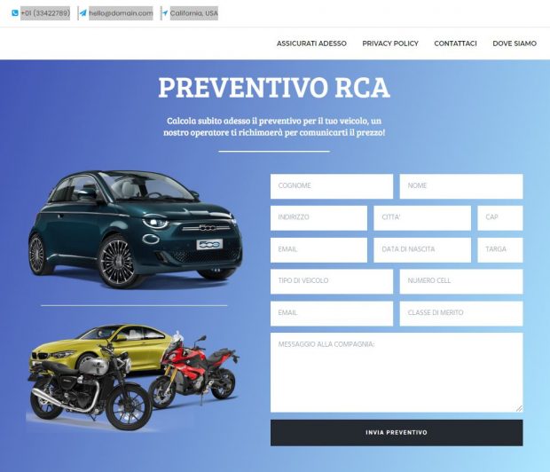 Nella sezione “contatti”, si fa riferimento a uffici in via Verdi 30100 a Milano, e-mail assicurazionifacile@virgilio.it, cellulari 377-3755890 e 333-4455666. C’è anche un riferimento “americano”: telefono +01 33422789, e-mail hello@domain.com, California, Usa.