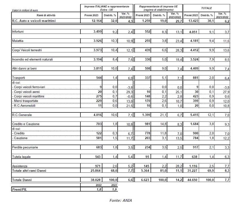 L’incidenza della raccolta danni totale sul Prodotto interno lordo è risultata in lieve aumento ed è stata pari all’1,9% nel 2023 (era 1,8% nel 2022).