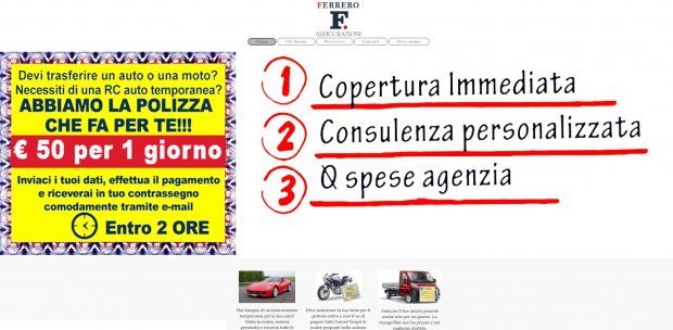 A distanza di poche settimane l’istituto di vigilanza segnala altri due portali quasi “simili” a questo. Si tratta di www.agenziaferrero.net (nella foto a lato la home page) e www.ferreroassicurazioni_0.gr8.com che riportano i dati identificativi di un broker regolarmente iscritto nel Registro unico degli intermediari assicurativi, il quale ha dichiarato la propria totale estraneità alle attività svolte tramite questi siti internet.