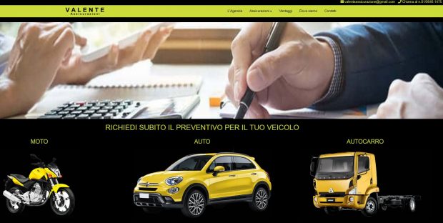 Polizze temporanee auto, moto e autocarro. Le propone e distribuisce il sito www.valenteassicurazioni.com che si presenta come un’azienda che «si concentra sulla mediazione di servizi assicurativi per la persona e le cose tenendo fede alla sua visione strategica», offrendo «ai suoi clienti prodotti con standard in termini di efficienza, trasparenza, semplicità e sicurezza».