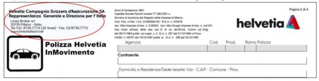 L’Ivass ha reso noto che è stata segnalata la commercializzazione, attraverso il sito www.assicurazioniriccio.com, di polizze Rc auto contraffatte «apparentemente» emesse e intermediate, rispettivamente, da Helvetia Compagnia Svizzera di Assicurazioni SA – Rappresentanza Generale e Direzione per l’Italia e da Linea Broker srl. Le polizze contraffatte presentano, in intestazione, la grafica riportata sopra. Helvetia ha confermato di non offrire sul mercato coperture assicurative Rc auto di durata temporanea e di non avere rapporti di collaborazione con l’intermediario Linea Broker s.r.l..