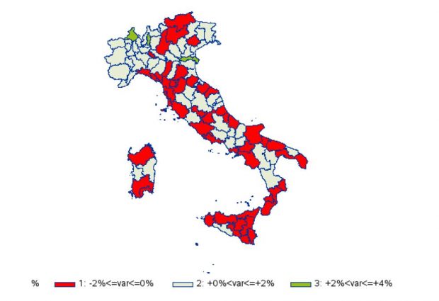 La figura in alto evidenzia la variazione su base annua del tasso di penetrazione della black box nelle province italiane. Per circa la metà delle province si osserva una contrazione nel tasso di penetrazione della scatola nera (province in rosso), con una riduzione compresa tra -2,9% (Catania) e -0,1% (Ancona, Bari, Brescia e Teramo). Tuttavia, a livello nazionale, fa presente l’Ivass, queste riduzioni sono quasi interamente controbilanciate per effetto degli incrementi registrati nelle restanti province (in bianco ed in verde).