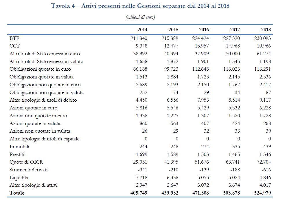 Gli investimenti in titoli di stato e obbligazioni hanno subito un calo dall’88% del totale nel 2014 a quasi l’83% nel 2018. I titoli di stato italiani, l’attivo principale scelto dalle gestioni separate, si sono ridotti dal 59% al 49%, mentre sono risultate in crescita le obbligazioni societarie, passate dal 23% del 2014 al 25% del 2018. Le quote di Oicr si sono incrementate crescendo dal 7% del 2014 al 14% del 2018.