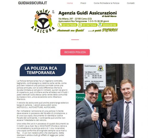 Anche in questo caso, nell’home page sono ben visibili tre persone con alle loro spalle un riferimento a Groupama Assicurazioni. Identici anche i contatti riportati sul portale: uffici in via Milano 297 a Como, telefono 0315476926 e mob. 3205529192.
