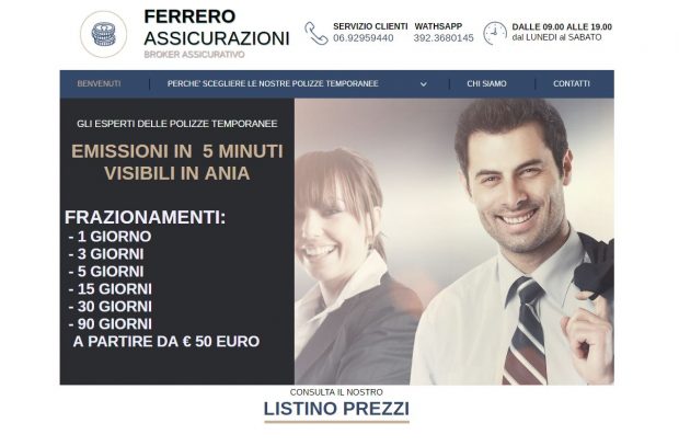 In particolare, l’intestazione nella home page è quella della Ferrero Assicurazioni broker assicurativo e si autodefinisce come “gli esperti delle polizze temporanee” con “emissioni in 5 minuti visibili in Ania”. L’agenzia fornisce una «consulenza professionale e assistenza per aiutarvi a trovare la soluzione più adatta alle vostre esigenze. In un mercato sempre più aggressivo e difficile da interpretare, ci poniamo come un partner leale. Il titolare Ferrero P. il quale ogni giorno con passione ricambia la fiducia che migliaia di persone ci accordano da anni, svolgendo il proprio lavoro con competenza». Poi dà anche i numeri: 600 pratiche evase ogni settimana, 3 premi (?) vinti e 2.767 clienti soddisfatti nel 2016.