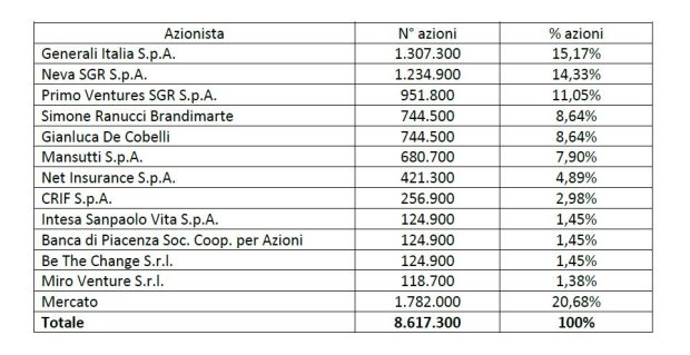 La raccolta ha consentito il superamento del requisito minimo del flottante ai sensi del Regolamento Euronext Growth Milan consentendo dunque la possibilità di poter effettuare il passaggio al segmento ordinario di Euronext Growth Milan in tempi brevi. Nella tabella sotto, la composizione degli azionisti di Yolo.